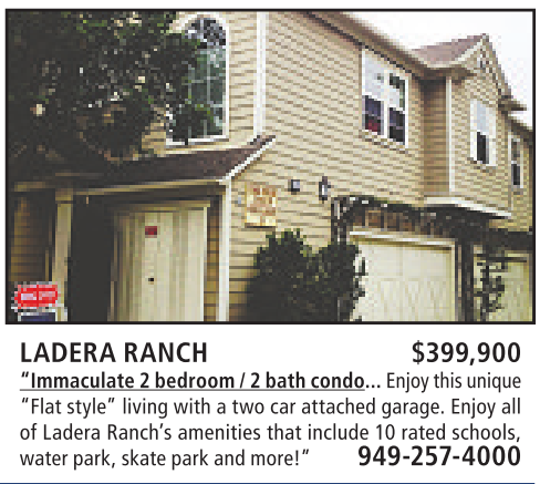 “Flat style” living with atwo car attached garage. Enjoy all of Ladera Ranch’s amenities that include 10 rated schools, waterpark, skate park andmore!” 949-257-4000