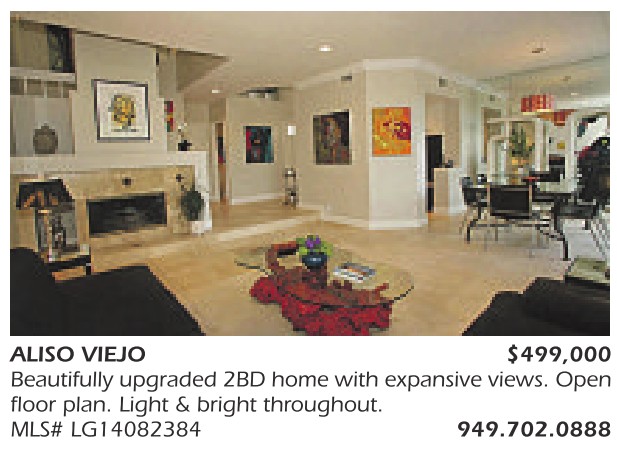 ALISO VIEJO $499,000 Beautifully upgraded 2BD home with expansive views. Open floor plan. Light & bright throughout. MLS# LG14082384 949.702.0888