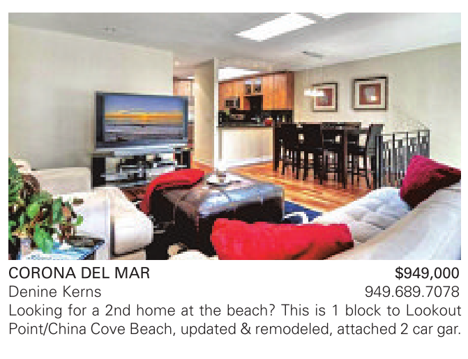 Corona del Mar $949,000 Denine Kerns 949.689.7078 Looking for a 2nd home at the beach? This is 1 block to Lookout Point/China Cove Beach, updated &remodeled, attached 2car gar.