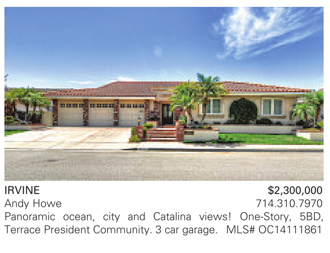 IrvIne $2,300,000 Andy Howe 714.310.7970 Panoramic ocean, city and Catalina views! One-Story, 5BD, Terrace President Community. 3 car garage. MLS# OC14111861