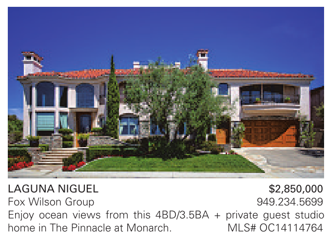 laguna nIguel $2,850,000 Fox Wilson Group 949.234.5699 Enjoy ocean views from this 4BD/3.5BA + private guest studio home in The Pinnacle at Monarch. MLS# OC14114764