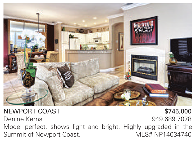 newport Coast $745,000 Denine Kerns 949.689.7078 Model perfect, shows light and bright. Highly upgraded in the Summit of Newport Coast. MLS# NP14034740