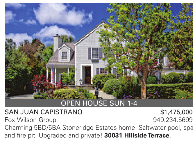 open house sun 1-4 san Juan CapIstrano $1,475,000 Fox Wilson Group 949.234.5699 Charming 5BD/5BA Stoneridge Estates home. Saltwater pool, spa and fire pit. Upgraded and private! 30031 Hillside Terrace.