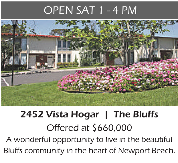 2452 Vista Hogar | The Bluffs Offered at $660,000 A wonderful opportunity to live in the beautiful Bluffs community in the heart of Newport Beach.