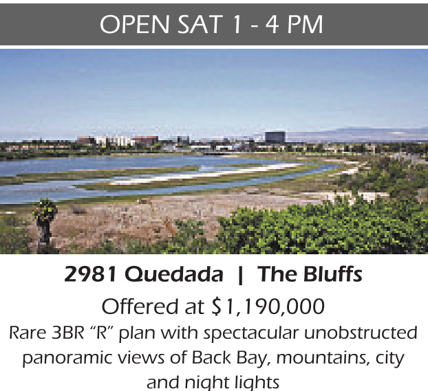2981 Quedada | The Bluffs Offered at $1,190,000 Rare 3BR “R” plan with spectacular unobstructed panoramic views of Back Bay, mountains, city and night lights