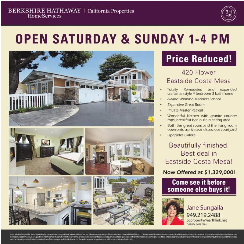 O P E N S AT U R D AY & S U N D AY 1- 4 P M Price Reduced! 420 Flower Eastside Costa Mesa Beautifully finished. Best deal in Eastside Costa Mesa! Now Offered at $1,329,000! Come see it before someone else buys it! Jane Sungaila 949.219.2488 ocproperty@earthlink.net CalBRE# 00597991 ©2014BHHAffiliates,LLC.AnindependentlyoperatedsubsidiaryofHomeServicesofAmerica,Inc.,aBerkshireHathawayaffiliate,andafranchiseeofBHHAffiliates,LLC.BerkshireHathawayHomeServicesandtheBerkshireHathawayHomeServicessymbolareregisteredservicemarksof HomeServicesofAmerica,Inc.®EqualHousingOpportunity.BerkshireHathawayHomeServicesdoesnotguaranteetheaccuracyofsquarefootage,lotsizeorotherinformationconcerningtheconditionorfeaturesofpropertyprovidedbythesellerorobtainedfrompublicrecordsorothersources, and the buyer is advised to independently verify the accuracyofthat information through personal inspection and with appropriateprofessionals.