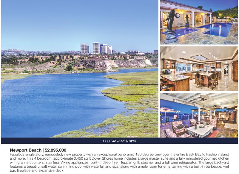 1736 GALAXY DRIVE Newport Beach | $2,895,000 Fabulous single story, remodeled, view property with an exceptional panoramic 180 degree view over the entire Back Bay to Fashion Island and more. This 4 bedroom, approximate 3,450 sq ft Dover Shores home includes a large master suite and a fully remodeled gourmet kitchen with granite counters, stainless Viking appliances, built-in deep fryer, Teppan grill, steamer and a full wine refrigerator. The large backyard features a beautiful salt water swimming pool with waterfall and spa, along with ample room for entertaining with a built-in barbeque, wet bar, fireplace and expansive deck.