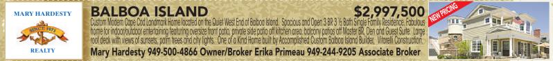 MARY HARDESTY REALTY B C home for indoor/outdoor entertaining featuring oversize front patio, private side patio off kitchen area, balcony patios off Master BR, Den and Guest Suite. Large BALBOA ISLAND $2,997,500 Custom ModernCapeCod Landmark Home locatedonthe Quiet West EndofBalboa Island. Spacious andOpen3BR3½Bath Single Family Residence.Fabulous homefor indoor/outdoor entertaining featuring oversizefront patio,private side patio offkitchen area, balconypatiosoff Master BR,Den andGuest Suite. Large roof deck with views ofsunsets,palmtrees andcitylights. One of aKindHome builtbyAccomplishedCustomBalboa IslandBuilder, Vitarelli Construction. Mary Hardesty 949-500-4866 Owner/Broker Erika Primeau 949-244-9205 Associate Broker