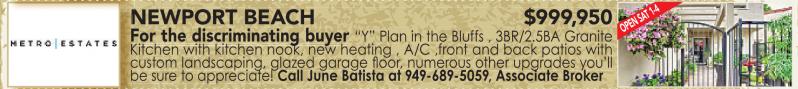 N F N NEWPORT BEACH $999,950 For the discriminating buyer “Y” Plan in the Bluffs , 3BR/2.5BA Granite Kitchen with kitchen nook, new heating , A/C ,front and back patios with custom landscaping, glazed garage floor, numerous other upgrades you’ll be sure to appreciate! be sure to appreciate! Call June Batista at 949-689-5059, Associate Broker