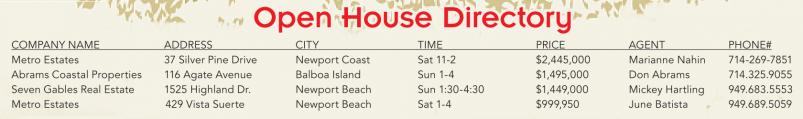 Open House Directory Open House Directory COMPANY NAME ADDRESS CITY TIME PRICE AGENT PHONE# Metro Estates 37 Silver Pine Drive Newport Coast Sat 11-2 $2,445,000 Marianne Nahin 714-269-7851 Abrams Coastal Properties 116 Agate Avenue Balboa Island Sun 1-4 $1,495,000 Don Abrams 714.325.9055 Seven Gables Real Estate 1525 Highland Dr. Newport Beach Sun 1:30-4:30 $1,449,000 Mickey Hartling 949.683.5553 Metro Estates 429 Vista Suerte Newport Beach Sat 1-4 $999,950 June Batista 949.689.5059