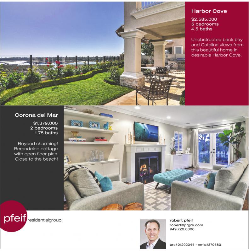 Harbor Cove $2,585,000 5 bedrooms 4.5 baths Unobstructed back bay and Catalina views from this beautiful home in desirable Harbor Cove. Corona del Mar $1,379,000 2 bedrooms 1.75 baths Beyond charming! Remodeled cottage with open floor plan. Close to the beach! robert pfeif robert@prgre.com 949.720.8300 bre#01292044 • nmls#379580