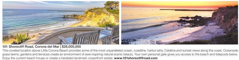 101 Shorecliff Road, Corona del Mar | $28,000,000 This coveted location above Little Corona Beach provides some of the most unparalleled ocean, coastline, harbor jetty, Catalina and sunset views along the coast. Oceanside grass lawns, gardens and terraces create an environment of awe inspiring natural scenic beauty. Your own personal gate gives you access to the beach and tidepools below. Enjoy the current beach house or create a heralded landmark oceanfront estate. www.101shorecliffroad.com
