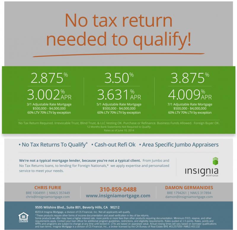 ©2014 Insignia Mortgage, a division of CS Financial, Inc. Not all applicants will qualify. *These products require other forms of income documentation and asset verification in lieu of tax returns. Some products we offer may have ahigher interest rate, more points or more fees than other products requiring documentation. Minimum FICO, reserve, and other requirements apply. Contact your loan officer for additional program guidelines, restrictions, and eligibility requirements. Rates quoted at 1.5 points. Rates, points and APRs and programs are subject to change at any time until locked-in. LTVs are based on appraised value. Actual closing times will vary based on borrower qualifications and loan terms. Insignia Mortgage is adivision of CS Financial, Inc., abroker licensed by the CA Bureau of Real Estate BRE #01257559 |NMLS #31132