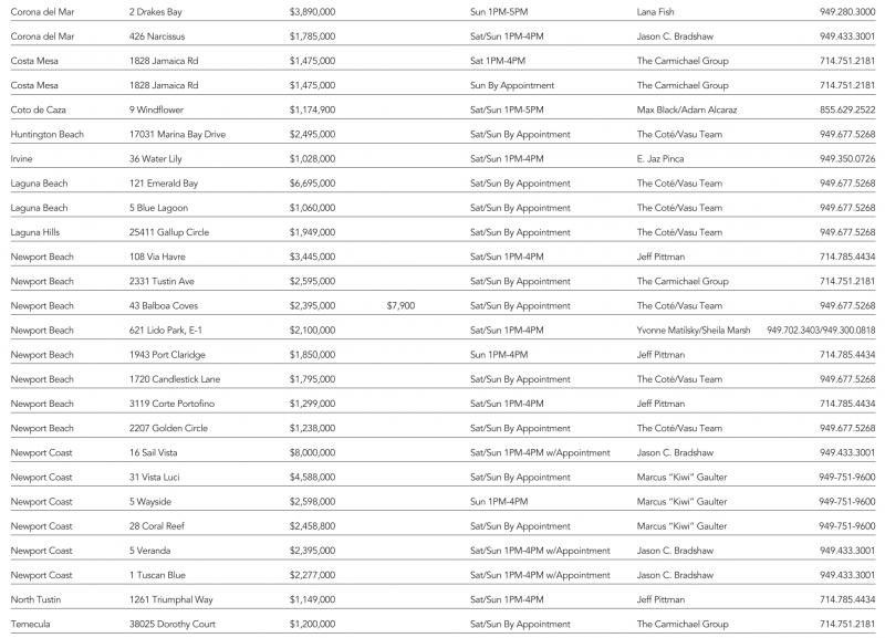 Costa Mesa 1828 Jamaica Rd $1,475,000 Sat 1PM-4PM The Carmichael Group 714.751.2181 Costa Mesa 1828 Jamaica Rd $1,475,000 Sun By Appointment The Carmichael Group 714.751.2181 Coto de Caza 9Windflower $1,174,900 Sat/Sun 1PM-5PM Max Black/Adam Alcaraz 855.629.2522 Huntington Beach 17031 Marina Bay Drive $2,495,000 Sat/Sun By Appointment The Coté/Vasu Team 949.677.5268 Irvine 36 Water Lily $1,028,000 Sat/Sun 1PM-4PM E. Jaz Pinca 949.350.0726 Laguna Beach 121 Emerald Bay $6,695,000 Sat/Sun By Appointment The Coté/Vasu Team 949.677.5268 Laguna Beach 5Blue Lagoon $1,060,000 Sat/Sun By Appointment The Coté/Vasu Team 949.677.5268 Laguna Hills 25411 Gallup Circle $1,949,000 Sat/Sun By Appointment The Coté/Vasu Team 949.677.5268 Newport Beach 108 Via Havre $3,445,000 Sat/Sun 1PM-4PM Jeff Pittman 714.785.4434 Newport Beach 2331 Tustin Ave $2,595,000 Sat/Sun By Appointment The Carmichael Group 714.751.2181 Newport Beach 43 Balboa Coves $2,395,000 $7,900 Sat/Sun By Appointment The Coté/Vasu Team 949.677.5268 Newport Beach 621 Lido Park, E-1 $2,100,000 Sat/Sun 1PM-4PM Yvonne Matilsky/Sheila Marsh 949.702.3403/949.300.0818