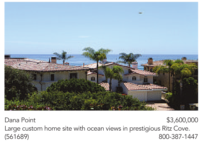 Dana Point $3,600,000 Large custom home site with ocean views in prestigious Ritz Cove. (561689) 800-387-1447