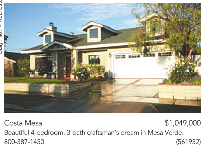 Costa Mesa $1,049,000 Beautiful 4-bedroom, 3-bath craftsman’s dream in Mesa Verde. 800-387-1450 (561932)