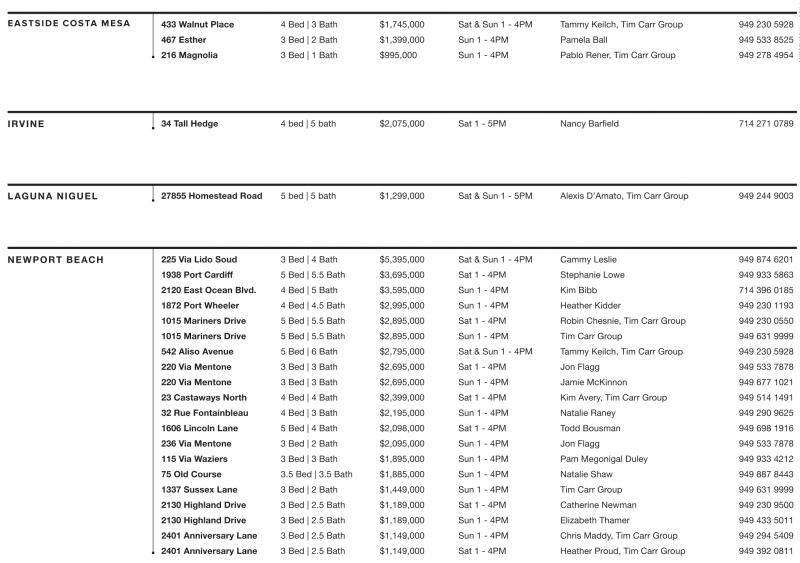 newport beach 225 Via Lido Soud 3 Bed | 4 Bath $5,395,000 Sat & Sun 1 - 4PM Cammy Leslie 949 874 6201 1938 port cardiff 5 Bed | 5.5 Bath $3,695,000 Sat 1 - 4PM Stephanie Lowe 949 933 5863 2120 east ocean blvd. 4 Bed | 5 Bath $3,595,000 Sun 1 - 4PM Kim Bibb 714 396 0185 1872 port wheeler 4 Bed | 4.5 Bath $2,995,000 Sun 1 - 4PM Heather Kidder 949 230 1193 1015 Mariners Drive 5 Bed | 5.5 Bath $2,895,000 Sat 1 - 4PM Robin Chesnie, Tim Carr Group 949 230 0550 1015 Mariners Drive 5 Bed | 5.5 Bath $2,895,000 Sun 1 - 4PM Tim Carr Group 949 631 9999 542 aliso avenue 5 Bed | 6 Bath $2,795,000 Sat & Sun 1 - 4PM Tammy Keilch, Tim Carr Group 949 230 5928 220 Via Mentone 3 Bed | 3 Bath $2,695,000 Sat 1 - 4PM Jon Flagg 949 533 7878 220 Via Mentone 3 Bed | 3 Bath $2,695,000 Sun 1 - 4PM Jamie McKinnon 949 677 1021 23 castaways north 4 Bed | 4 Bath $2,399,000 Sat 1 - 4PM Kim Avery, Tim Carr Group 949 514 1491 32 rue Fontainbleau 4 Bed | 3 Bath $2,195,000 Sun 1 - 4PM Natalie Raney 949 290 9625 1606 Lincoln Lane 5 Bed | 4 Bath $2,098,000 Sat 1 - 4PM Todd Bousman 949 698 1916 236 Via Mentone 3 Bed | 2 Bath $2,095,000 Sun 1 - 4PM Jon Flagg 949 533 7878 115 Via waziers 3 Bed | 3 Bath $1,895,000 Sun 1 - 4PM Pam Megonigal Duley 949 933 4212 75 old course 3.5 Bed | 3.5 Bath $1,885,000 Sun 1 - 4PM Natalie Shaw 949 887 8443 1337 Sussex Lane 3 Bed | 2 Bath $1,449,000 Sun 1 - 4PM Tim Carr Group 949 631 9999 2130 highland Drive 3 Bed | 2.5 Bath $1,189,000 Sat 1 - 4PM Catherine Newman 949 230 9500 2130 highland Drive 3 Bed | 2.5 Bath $1,189,000 Sun 1 - 4PM Elizabeth Thamer 949 433 5011 2401 anniversary Lane 3 Bed | 2.5 Bath $1,149,000 Sun 1 - 4PM Chris Maddy, Tim Carr Group 949 294 5409 2401 anniversary Lane 3 Bed | 2.5 Bath $1,149,000 Sat 1 - 4PM Heather Proud, Tim Carr Group 949 392 0811