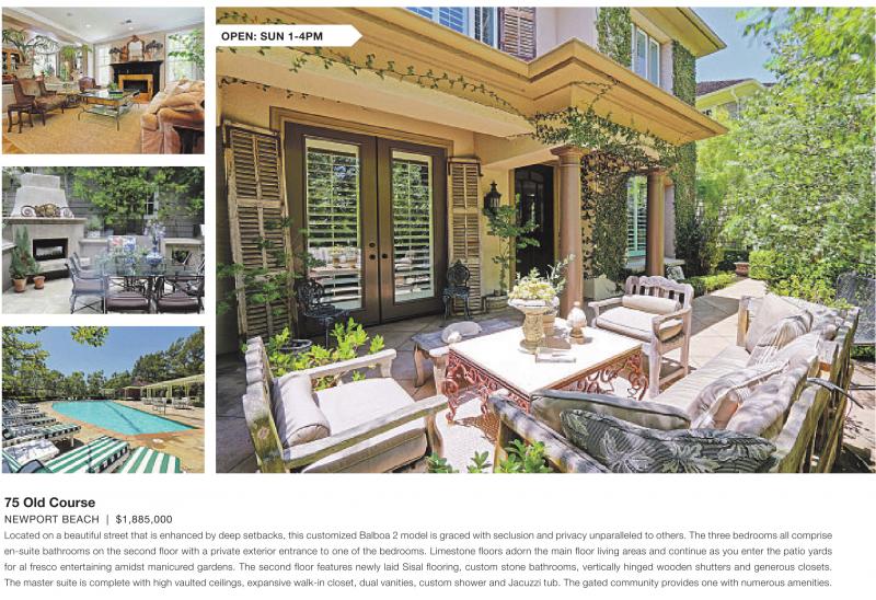 NEWPORT BEACH | $1,885,000 Located on a beautiful street that is enhanced by deep setbacks, this customized Balboa 2 model is graced with seclusion and privacy unparalleled to others. The three bedrooms all comprise en-suite bathrooms on the second floor with a private exterior entrance to one of the bedrooms. Limestone floors adorn the main floor living areas and continue as you enter the patio yards for al fresco entertaining amidst manicured gardens. The second floor features newly laid Sisal flooring, custom stone bathrooms, vertically hinged wooden shutters and generous closets. The master suite is complete with high vaulted ceilings, expansive walk-in closet, dual vanities, custom shower and Jacuzzi tub. The gated community provides one with numerous amenities.