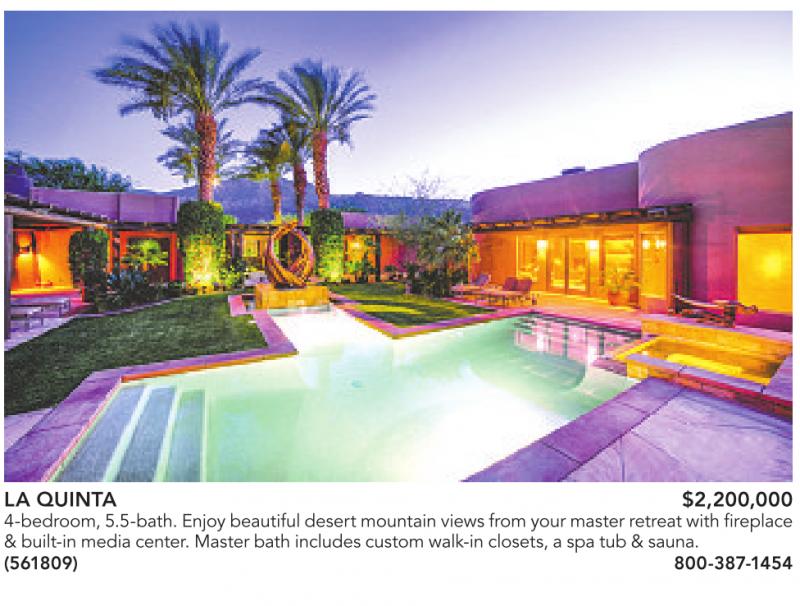 LA QUINTA $2,200,000 4-bedroom,5.5-bath. Enjoy beautiful desert mountain viewsfromyourmasterretreat with fireplace &built-inmedia center. Master bath includes custom walk-inclosets,aspa tub&sauna. (561809) 800-387-1454