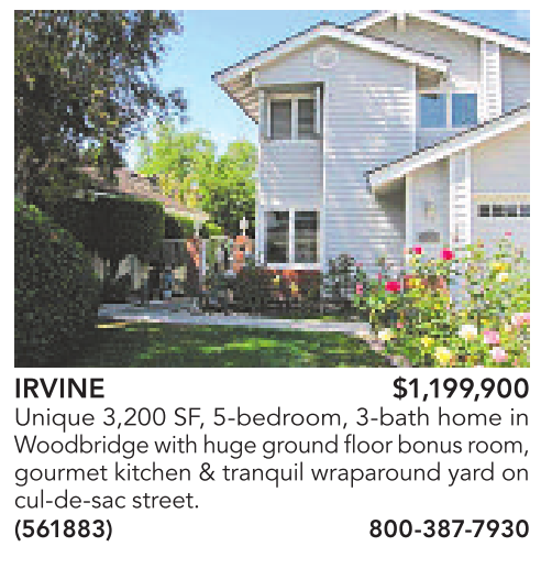 IRVINE $1,199,900 Unique 3,200 SF, 5-bedroom, 3-bath home in Woodbridge with hugeground floor bonusroom, gourmet kitchen & tranquil wraparound yard on cul-de-sac street. (561883) 800-387-7930
