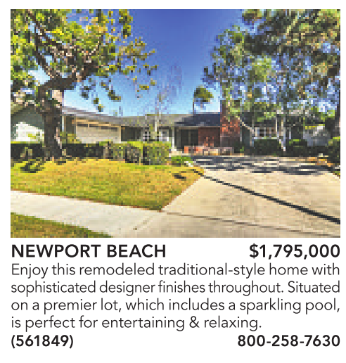 NEWPORT BEACH $1,795,000 Enjoy this remodeledtraditional-stylehomewith sophisticateddesigner finishesthroughout.Situated on apremier lot, whichincludesasparkling pool, is perfectfor entertaining &relaxing. (561849) 800-258-7630