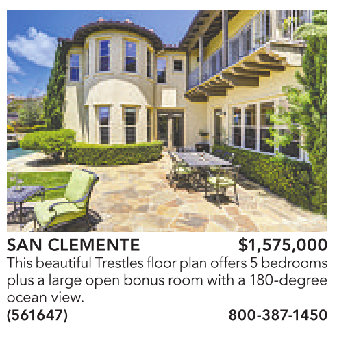 SAN CLEMENTE $1,575,000 This beautiful Trestles floor plan offers 5bedrooms plus alargeopenbonus room with a180-degree oceanview. (561647) 800-387-1450
