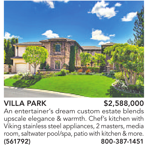 VILLA PARK $2,588,000 An entertainer’s dream custom estate blends upscale elegance & warmth. Chef’s kitchen with Viking stainlesssteel appliances, 2masters,media room,saltwater pool/spa,patio with kitchen&more. (561792) 800-387-1451