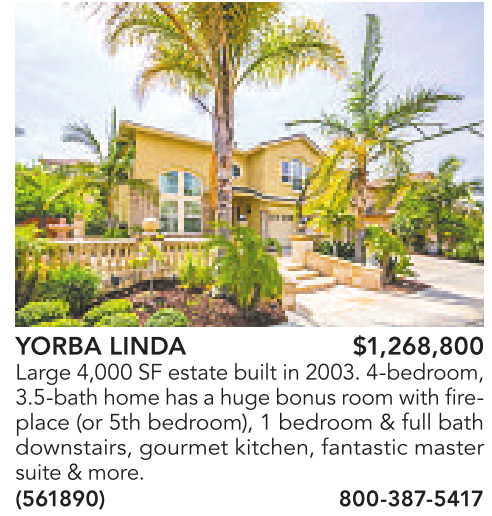 YORBA LINDA $1,268,800 Large4,000 SF estate builtin2003. 4-bedroom, 3.5-bath home hasahugebonus room with fireplace (or 5th bedroom), 1 bedroom & full bath downstairs, gourmet kitchen, fantastic master suite&more. (561890) 800-387-5417