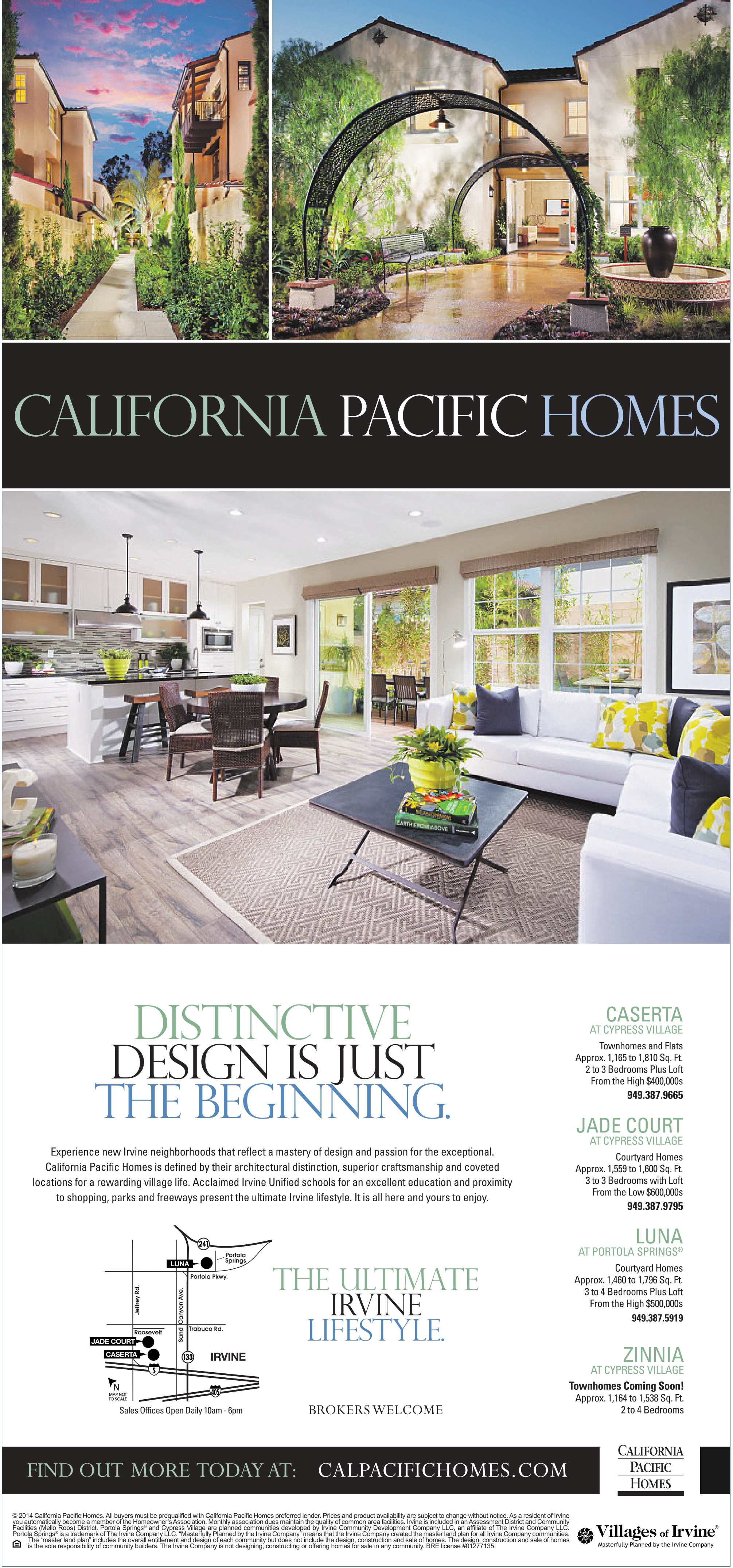 California Pacific Homes is defined by their architectural distinction, superior craftsmanship and coveted locations for a rewarding village life. Acclaimed Irvine Unified schools for an excellent education and proximity to shopping, parks and freeways present the ultimate Irvine lifestyle. It is all here and yours to enjoy.