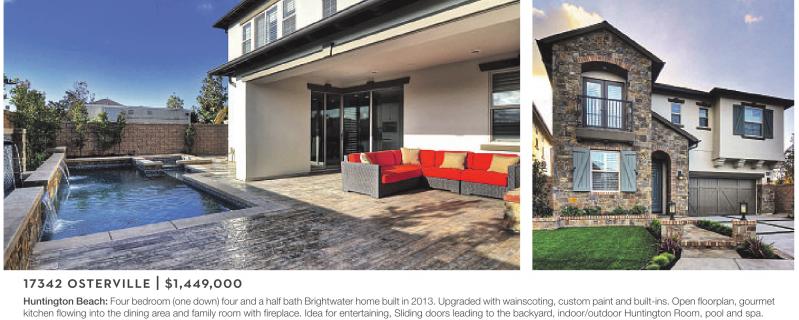 17342 OSTERVILLE | $1,449,000 Huntington Beach: Four bedroom (one down) four and a half bath Brightwater home built in 2013. Upgraded with wainscoting, custom paint and built-ins. Open floorplan, gourmet kitchen flowing into the dining area and family room with fireplace. Idea for entertaining, Sliding doors leading to the backyard, indoor/outdoor Huntington Room, pool and spa.