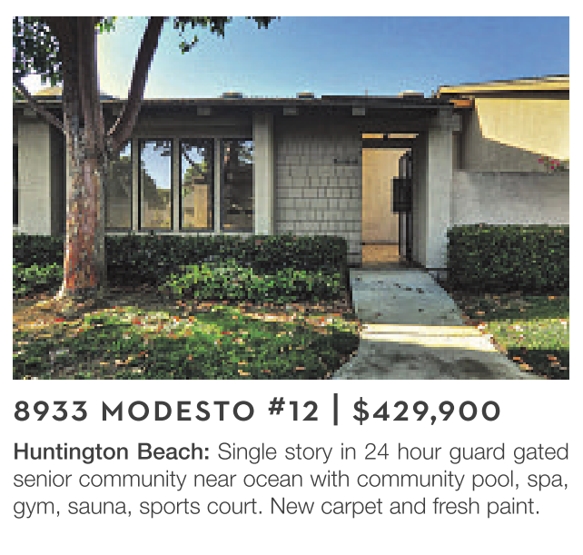 Huntington Beach: Single story in 24 hour guard gated senior community near ocean with community pool, spa, gym, sauna, sports court. New carpet and fresh paint.
