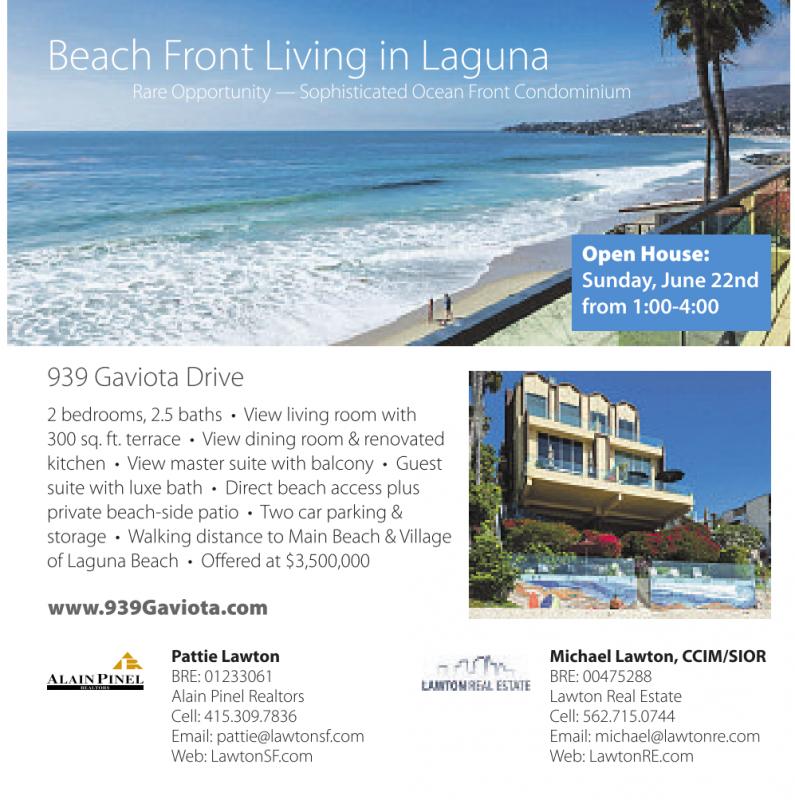 Beach Front Living in Laguna Rare Opportunity—Sophisticated Ocean Front Condominium Open House: Sunday, June 22nd from 1:00-4:00 939 Gaviota Drive 2bedrooms,2.5 baths • View living room with 300 sq.ft. terrace • View dining room &renovated kitchen • View master suitewith balcony • Guest suitewith luxebath • Directbeach access plus privatebeach-side patio • Two car parking & storage • Walking distance to Main Beach &Village of Laguna Beach • Offeredat$3,500,000 www.939Gaviota.com Pattie Lawton BRE: 01233061 Alain Pinel Realtors Cell: 415.309.7836 Email: pattie@lawtonsf.com Web: LawtonSF.com Michael Lawton, CCIM/SIOR BRE: 00475288 Lawton Real Estate Cell: 562.715.0744 Email: michael@lawtonre.com Web: LawtonRE.com