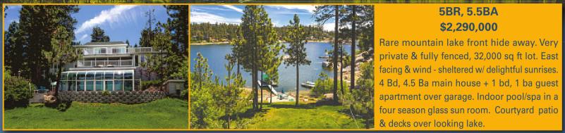Rare mountain lake front hide away. Very private & fully fenced, 32,000 sq ft lot. East facing & wind - sheltered w/ delightful sunrises. 4 Bd, 4.5 Ba main house + 1 bd, 1 ba guest apartment over garage. Indoor pool/spa in a four season glass sun room. Courtyard patio & decks over looking lake.