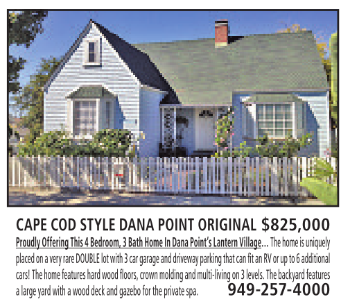 CAPE COD STYLE DANA POINT ORIGINAL $825,000 ProudlyOffering This 4Bedroom,3BathHome In Dana Point’s LanternVillage… Thehome is uniquely placed on averyrareDOUBLElot with 3car garageand driveway parkingthat canfitanRVorupto6additional cars!The home featureshardwood floors, crown molding andmulti-living on 3levels. Thebackyard features alarge yard with awood deck andgazebo for theprivatespa. 949-257-4000