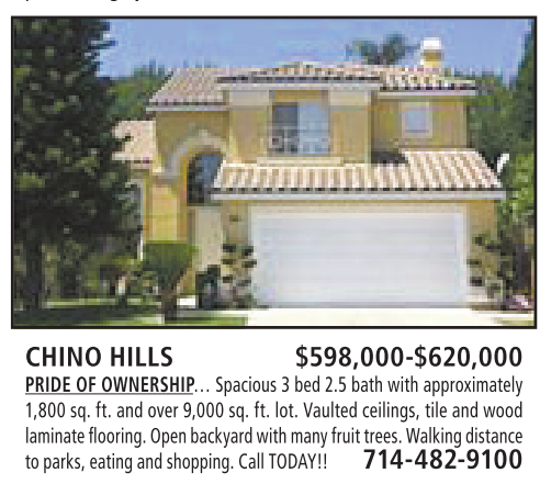 CHINO HILLS $598,000-$620,000 PRIDE OFOWNERSHIP… Spacious 3bed 2.5 bath with approximately 1,800 sq. ft. and over 9,000 sq. ft. lot. Vaulted ceilings, tile and wood laminateflooring.Openbackyard with many fruit trees. Walkingdistance to parks, eatingand shopping. Call TODAY!! 714-482-9100