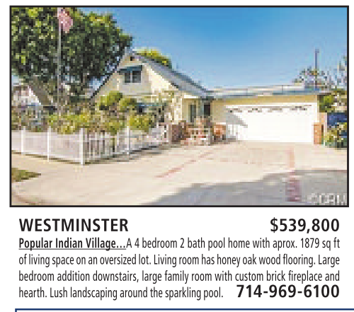 WESTMINSTER $539,800 Popular Indian Village…A 4bedroom 2bath pool home with aprox. 1879 sq ft of living space on an oversizedlot.Living room hashoneyoak wood flooring.Large bedroom addition downstairs, large family room with custom brick fireplace and hearth.Lushlandscapingaround thesparkling pool. 714-969-6100