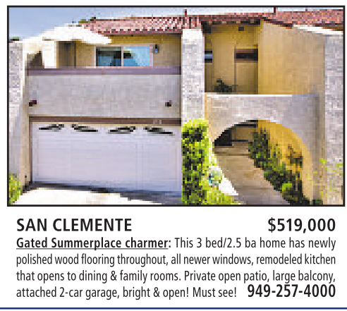 SAN CLEMENTE $519,000 Gated Summerplace charmer: This 3bed/2.5 ba home has newly polished wood flooring throughout,all newer windows, remodeledkitchen that opens to dining&familyrooms.Privateopenpatio, large balcony, attached2-car garage, bright&open! Must see! 949-257-4000