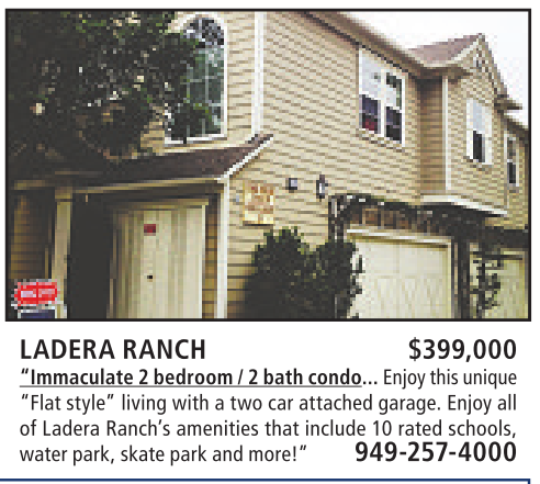 “Flat style” living with atwo car attached garage. Enjoy all of Ladera Ranch’s amenities that include 10 rated schools, waterpark, skate park andmore!” 949-257-4000