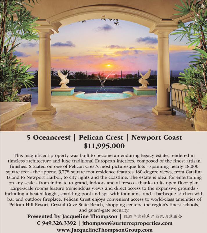 5 Oceancrest | Pelican Crest | Newport Coast $11,995,000 This magnificent property was built to become an enduring legacy estate, rendered in timeless architecture and luxe traditional European interiors, composed of the finest artisan finishes. Situated on one of Pelican Crest’s most picturesque lots - spanning nearly 18,000 square feet - the approx. 9,778 square foot residence features 180-degree views, from Catalina Island to Newport Harbor, to city lights and the coastline. The estate is ideal for entertaining on any scale - from intimate to grand, indoors and al fresco - thanks to its open floor plan. Large-scale rooms feature tremendous views and direct access to the expansive grounds - including a heated loggia, sparkling pool and spa with fountains, and a barbeque kitchen with bar and outdoor fireplace. Pelican Crest enjoys convenient access to world-class amenities of Pelican Hill Resort, Crystal Cove State Beach, shopping centers, the region’s finest schools, and guard-gate security. Presented by Jacqueline Thompson | C 949.326.3392 | jthompson@surterreproperties.com www.JacquelineThompsonGroup.com