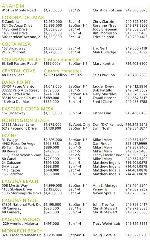 COSTA MESA 167 Broadway $1,350,000 Sat 1-4 Eric Neff 949.500.7119 215 23 rd Street $1,279,000 Sat 1-4 Mali Gulledge 949.500.4399 COVENANT HILLS Custom Homesites 63 Bell Pasture Road* $619,000+ Sat/Sun 1-5 Mary Kontra 714.403.6500 CRYSTAL COVE Custom Homesites 48 Deep Sea* $2.5-7.1 Million Sat 10-5 Sales Pavilion 949.720.2683 DANA POINT 35451 Paseo Viento $1,049,000 Sat/Sun 1-4 Jackie | Drew 949.412.5814