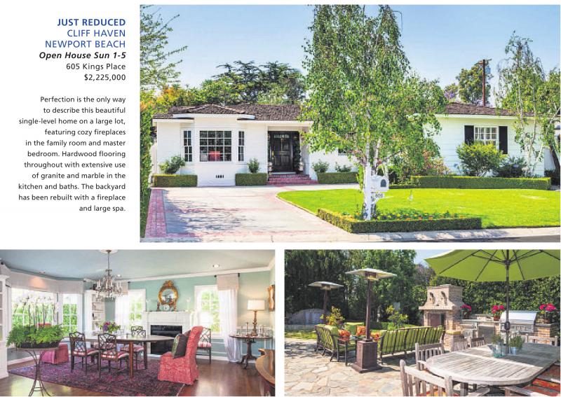 JUST REDUCED CLIFF HAVEN NEWPORT BEACH Open House Sun 1-5 605 Kings Place $2,225,000 Perfection is the only way to describe this beautiful single-level home on a large lot, featuring cozy fireplaces in the family room and master bedroom. Hardwood flooring throughout with extensive use of granite and marble in the kitchen and baths. The backyard has been rebuilt with a fireplace and large spa.