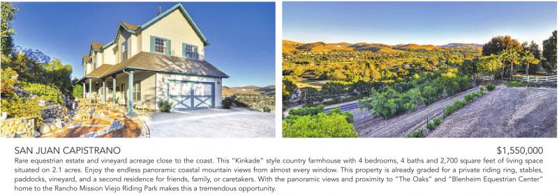 SAN JUAN CAPISTRANO $1,550,000 Rare equestrian estate and vineyard acreage close to the coast. This “Kinkade” style country farmhouse with 4 bedrooms, 4 baths and 2,700 square feet of living space situated on 2.1 acres. Enjoy the endless panoramic coastal mountain views from almost every window. This property is already graded for a private riding ring, stables, paddocks, vineyard, and a second residence for friends, family, or caretakers. With the panoramic views and proximity to “The Oaks” and “Blenheim Equestrian Center” home to the Rancho Mission Viejo Riding Park makes this a tremendous opportunity.