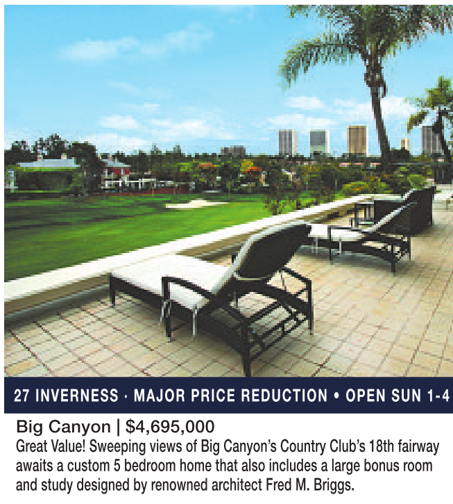 27 INVERNESS · MAJOR PRICE REDUCTION • OPEN SUN 1-4 Big Canyon | $4,695,000 Great Value! Sweeping views of Big Canyon’s Country Club’s 18th fairway awaits acustom 5bedroom home that also includes alarge bonus room and study designed by renowned architect Fred M. Briggs.