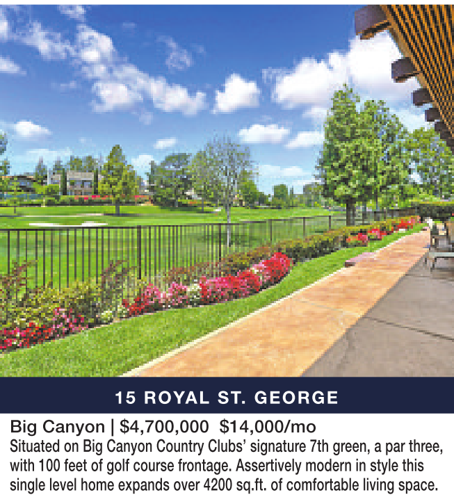15 ROYAL ST. GEORGE Big Canyon | $4,700,000 $14,000/mo Situated on Big Canyon Country Clubs’ signature 7th green, a par three, with 100 feet of golf course frontage. Assertively modern in style this single level home expands over 4200 sq.ft. of comfortable living space.