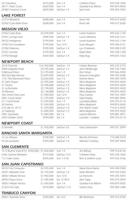 2210 Channel $16,950,000 Sat/Sun 1-4 Coleen Brennan 949.275.2775 2908 Lafayette Road $4,295,000 Sat/Sun 1-4 John McMonigle 949.735.1004 5Belcourt Drive $3,195,000 Sun 1-4 Ron Felsot 949.466.4450 300 East Bay Avenue $2,849,000 Sat/Sun 1-5 Shauna Covington 949.395.8786 1721 Port Barmouth Place $2,650,000 Sun 1-5 Denine Kerns 949.689.7078 21 Saint Tropez $2,495,000 Sat/Sun 1-5 Mina Maghami 949.874.4020 21 Toulon $2,398,888 Sat/Sun 1-5 Mina Maghami 949.874.4020 21 La Rochelle $2,199,000 Sat/Sun 1-5 Mina Maghami 949.874.4020 39 Monaco $2,148,888 Sat/Sun 1-5 Mina Maghami 949.874.4020 336 Cherry Tree Lane $1,900,000 Sun 12-4 Paul Cawley 949.767.7043 2801 Cassia Street $1,725,000 Sat/Sun 1-4 Sally Shipley 949.887.9064 211 Canal Street $1,599,000 Sun 1-4 LaunderLaidlaw 949.375.0110 30 Vienna $1,450,000 Sat/Sun 1-5 Mina Maghami 949.874.4020 210 Lille Ln. #114 $1,249,000 Sat/Sun 1-4 Ann Marie Caster 714.612.0452 22 Salzburg $1,089,000 Sat/Sun 1-5 Mina Maghami 949.874.4020 2981 Quedada $1,089,000 Sat 1-4 Leanne Boman 949.887.9871 2269 Golden Circle $949,000 Sat 1-3 Launder /Laidlaw 949.375.0110