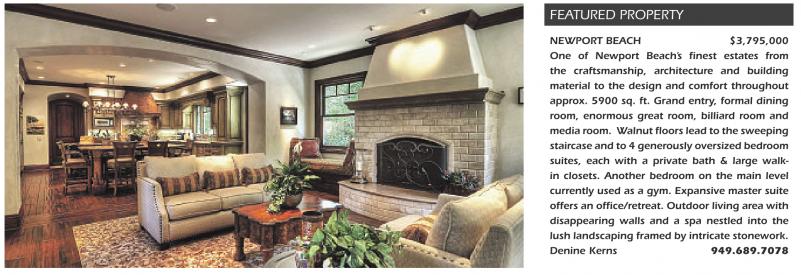 FEATURED PROPERTY NEWPORT BEACH $3,795,000 One of Newport Beach’s finest estates from the craftsmanship, architecture and building material to the design and comfort throughout approx. 5900 sq. ft. Grand entry, formal dining room, enormous great room, billiard room and media room. Walnut floors lead to the sweeping staircase and to 4 generously oversized bedroom suites, each with a private bath & large walkin closets. Another bedroom on the main level currently used as a gym. Expansive master suite offers an office/retreat. Outdoor living area with disappearing walls and a spa nestled into the lush landscaping framed by intricate stonework. Denine Kerns 949.689.7078