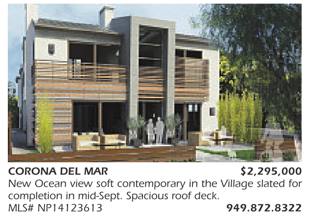 CORONA DEL MAR $2,295,000 New Ocean view soft contemporary in the Village slated for completion in mid-Sept. Spacious roof deck. MLS# NP14123613 949.872.8322