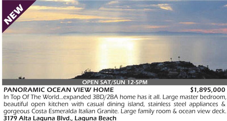 OPEN SAT/SUN 12-5PM PANORAMIC OCEAN VIEW HOME $1,895,000 In Top Of The World...expanded 3BD/2BA home has it all. Large master bedroom, beautiful open kitchen with casual dining island, stainless steel appliances &gorgeous Costa Esmeralda Italian Granite. Large family room & ocean view deck. 3179 Alta Laguna Blvd., Laguna Beach