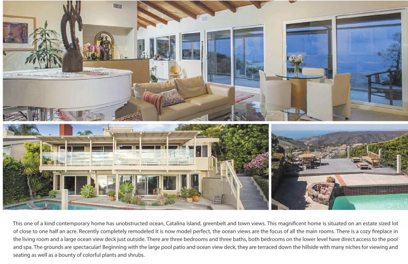 This one of a kind contemporary home has unobstructed ocean, Catalina Island, greenbelt and town views. This magnificent home is situated on an estate sized lot of close to one half an acre. Recently completely remodeled it is now model perfect, the ocean views are the focus of all the main rooms. There is a cozy fireplace in the living room and a large ocean view deck just outside. There are three bedrooms and three baths, both bedrooms on the lower level have direct access to the pool andspa. Thegrounds are spectacular! Beginning with thelarge pool patio and ocean view deck,theyare terraceddownthe hillside with manyniches for viewing and seating as well as a bounty of colorful plants and shrubs.