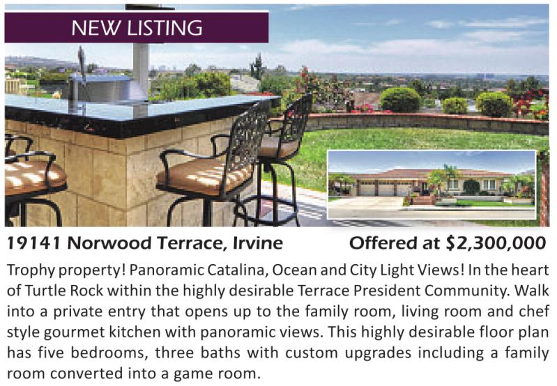NEW LISTING 19141 Norwood Terrace, Irvine Offered at $2,300,000 Trophyproperty!Panoramic Catalina, Ocean andCity LightViews!Inthe heart of Turtle Rock within the highly desirable Terrace President Community. Walk into a private entry that opens up to the family room, living room and chef style gourmet kitchen with panoramic views. This highly desirable floor plan has five bedrooms, three baths with custom upgrades including a family room converted into a game room. See also